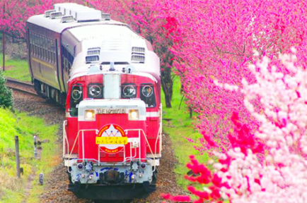 時期が合えば、線路沿いに植えられたハナモモとサクラのトンネルを列車が走る景観が楽しめます。